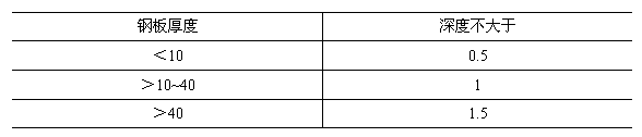 1.6 焊縫應(yīng)均勻平整,不應(yīng)有裂紋、夾渣、燒穿、未焊透等缺陷。重要部位的焊縫還不應(yīng)有氣孔,且咬肉長度不得超過焊縫長度的15%,咬肉深度應(yīng)符合表1的規(guī)定。