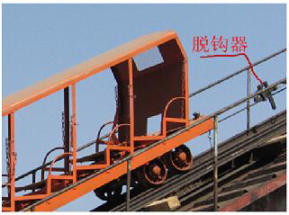 斜井人車脫鉤器一種脫鉤器,是在一個支承框架中,安裝三個鉸接杠桿,使其杠桿受力觸點的摩擦力減少,每個杠桿傳動比舊能增加,其總傳動比足夠大,能將30噸~40噸重的夯錘,實現(xiàn)人的單臂力可進行隨時脫鉤,或?qū)崿F(xiàn)司機可以控制的氣動力或電磁力進行應急脫鉤;在該框架中還安裝擋塊和限位軸,控制脫鉤后各杠桿的位移,利用撞擊反作用推力,自動復位呈靜態(tài)結(jié)構(gòu)狀態(tài);而且使得靜態(tài)結(jié)構(gòu)的重心線與夯錘的中心線相重合或接近重合,從而掛鉤很方便。